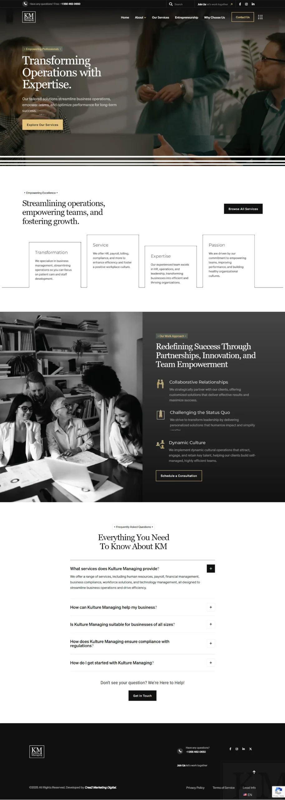 Diseñamos un sitio web personalizado y responsive para Kulture Managing, adaptable a todo tipo de dispositivos, con una estructura clara y enfocada en comunicar sus servicios de manera profesional.
